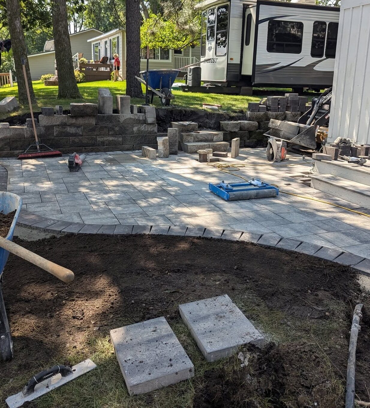 Elevate your landscape with vertical elements designed for both architectural impact and structural permanence. This section showcases our precision-built retaining walls, custom seat walls, and hardscape stairs—all engineered to master the unique soil pressures and extreme freeze-thaw cycles of the Red River Valley. From reclaiming sloped yards to creating permanent seating, our vertical features are built from the foundation up to stay perfectly level and secure for decades.”